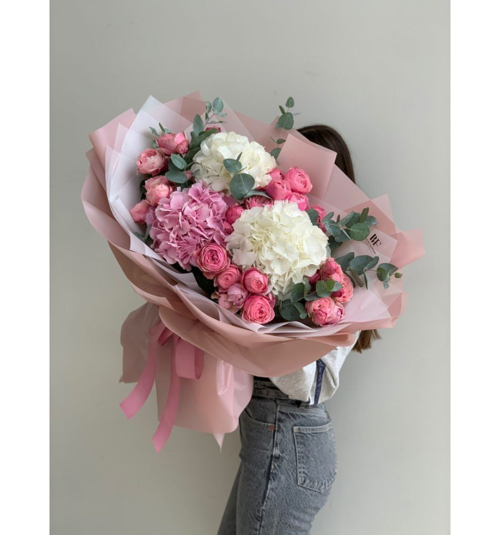 Букет из гортензий, кустовой розы и эвкалипта — гармоничное сочетание пышности, нежности и свежести. Объёмные соцветия гортензии придают композиции выразительность, розы добавляют романтики, а эвкалипт освежает и придаёт легкий аромат.